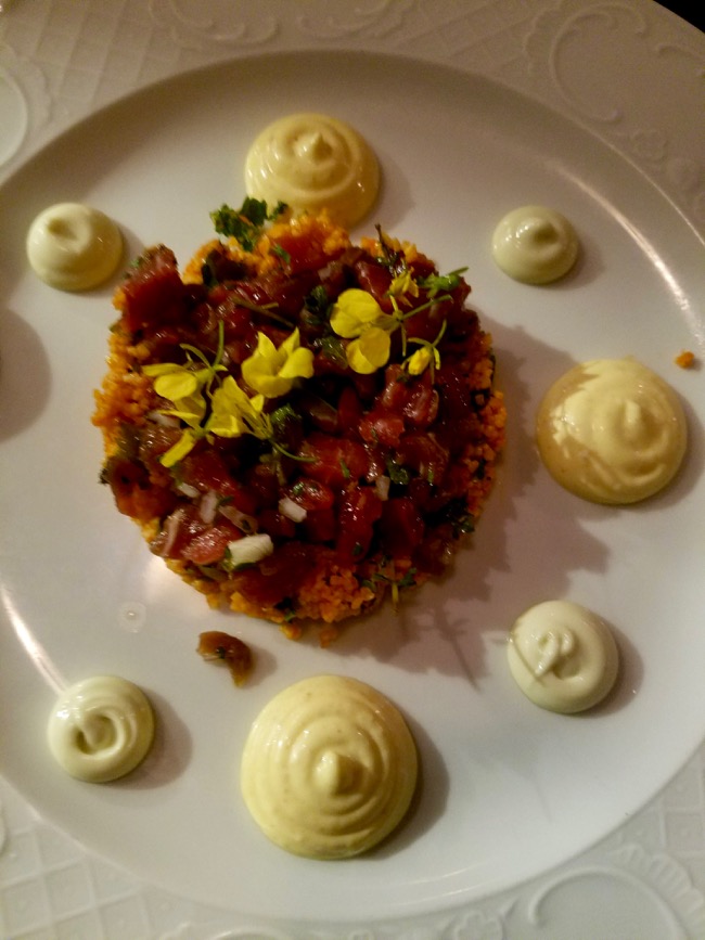 Rather than tease with a list of all the savory ingredients, I thought I’d share the snaps of our meal, course by course. Sadly we missed a couple, but we managed to capture most of the dishes despite our blissful tasting torpor. You’ll have to close your eyes to imagine the intoxicating scents of spices rising up with the steam and try to imagine the twang of middle eastern music and clinking glasses in the background.