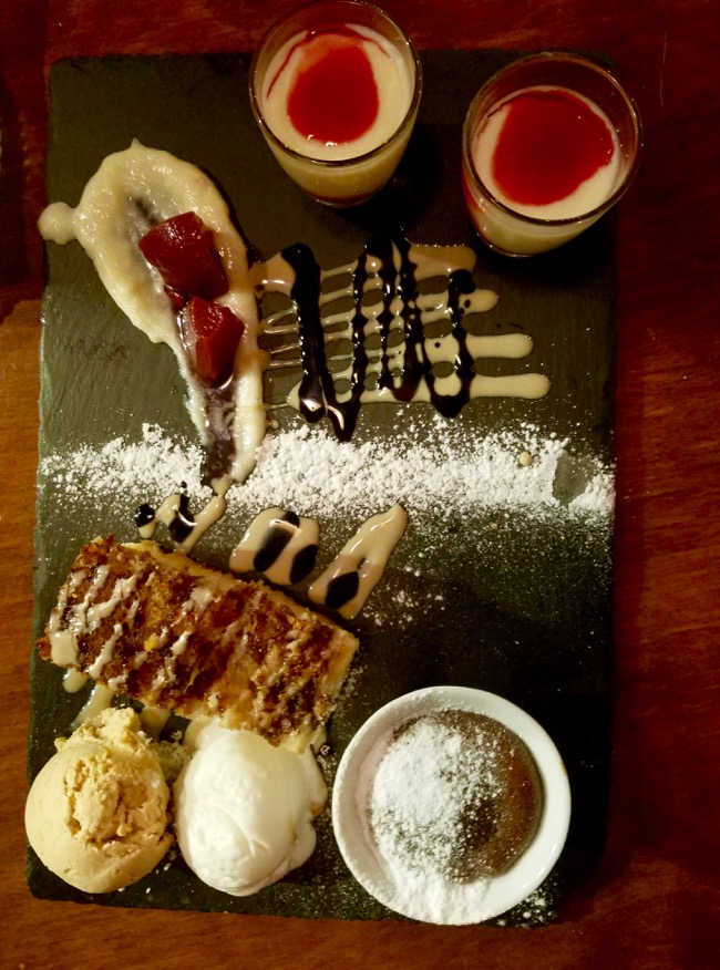 EIGHTEEN- TWENTY THREE: Locally sourced dessert plate, Including chocolate souffle, tahini ice cream, sesame cake, pears in wine sauce, and a rosewater and corn pudding
