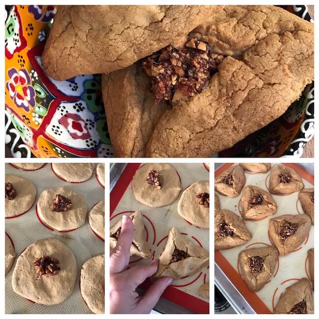 For Purim, let’s start with some easy to make cookies. Purim cookies are called Hamentaschen, literally “Haman’s hat” and are said to resemble the tricorn shaped hat of the purim story villian. My grandmother’s hand written Hamentaschen recipe is still the best ever, and I have also made Hamentaschen Pizza with mini pita bread in the past. This year is easier than ever… I’ve made gluten free Hamentaschen using a packaged gluten free sugar cookie mix and a filling that is 50% Date Spread and 50% chopped almonds.