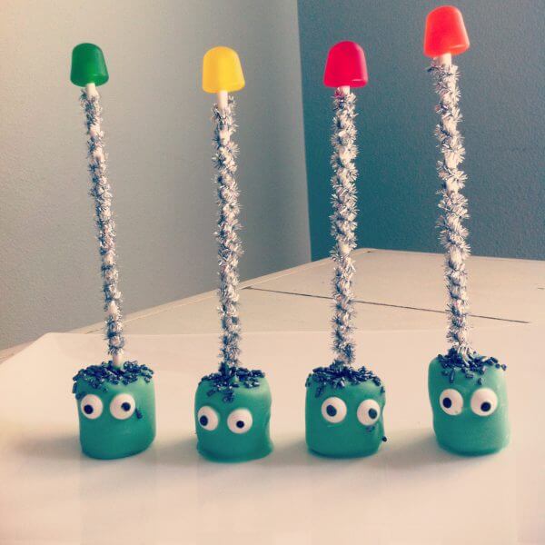 I used the lollipop sticks I had on hand, which are the long kind. If I made these again I’d probably opt for shorter sticks. All of the supplies (except the Marshmallows and Dots) were available at our local Michael’s store.