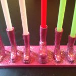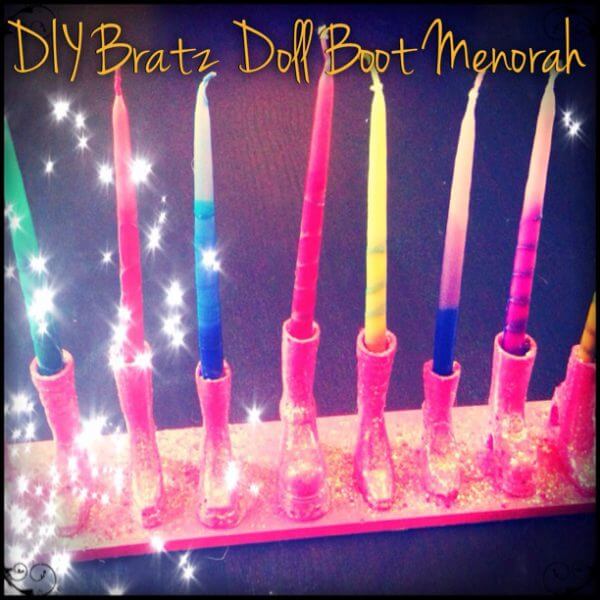 Though you know you should get rid of them, you don’t get around to it. And then Hanukah rolls around and you have a lightbulb moment and SCORE! The Bratz doll boot menorah is born. The exciting thing about this tutorial is that these puppies can be used with both candles (use extreme caution not to burn down your home or melt the boots though – tent with foil and don’t let em burn all the way) OR the 6 inch glow sticks I used for my DIY Lego Menorah. This one requires no drilling (sorry Dadfluential) like the Dinosaur Menorah did. A dusting of glitter is advisable.