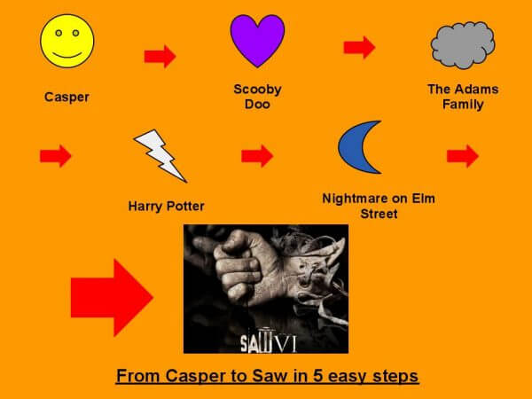 The frights were not all visual, either. After handing over full sized Snickers bars, one festive neighbor in a bloody wolf mask chased my 3 and 7 year old out of his house with a circular saw.