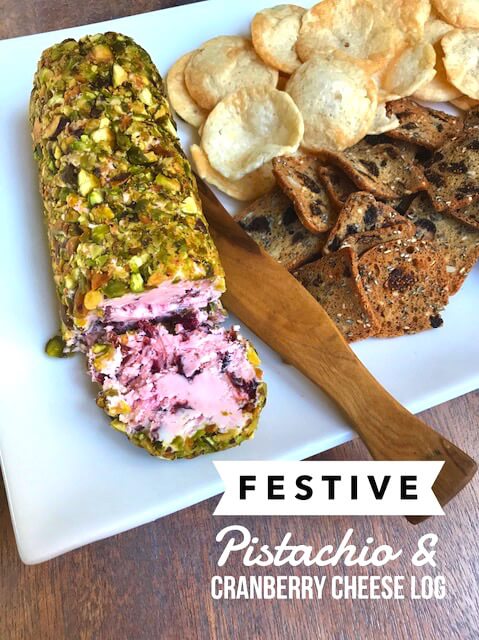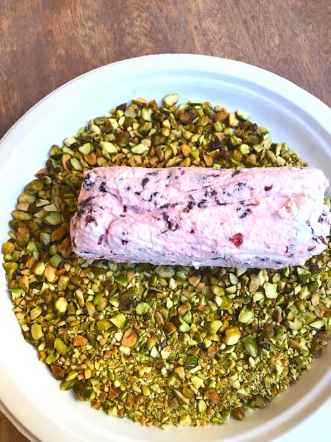 - Place chopped pistachio nuts on a plate, reserving some to scoop on the top of the log. Roll/press nuts into the cheese, coating as evenly as possible. Re-wrap the cheese log with cling wrap or waxed paper, re-shape if needed and chill until ready to serve. This is best made a day in advance and left to chill and set overnight.