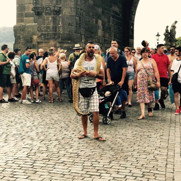 It’s a mystery to me why anyone would want to pose with a python, in the midst of a cobblestoned plaza. And I don’t know why we need so many amber trinkets and themed nesting dolls. The dolls are Russian, not Czech and even that is debatable once you start painting Kenny from South Park on them. What’s more, I don’t know the true origins of the doughy, sugary (not traditional) Trdlo stuffed with soft-serve. But I think I understand what it’s really about.