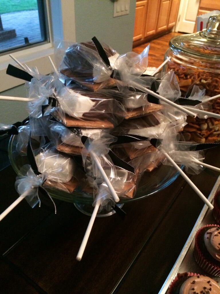 Then it hit me, stick the large square marshmallow on a stick, dip it in melted chocolate chips, set it on a half graham cracker square. Boom. Done.