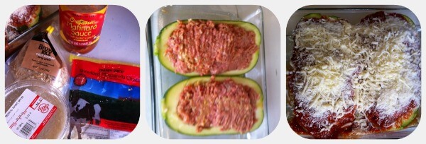 1. Scoop seeds and some of the flesh (carefully) out of an oversized zucchini that has been split in half.