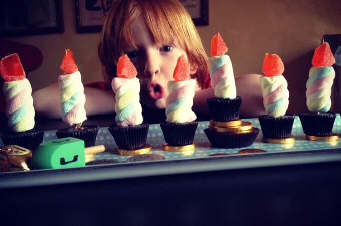 Here’s a Menorah that won’t last all 8 nights. But it will light up your children’s eyes! It’s made out of Marshmallow twists, peanut butter cups, gelt and orange “slices” gumdrops. Took about ten minutes to assemble. Less for our crowd to devour.