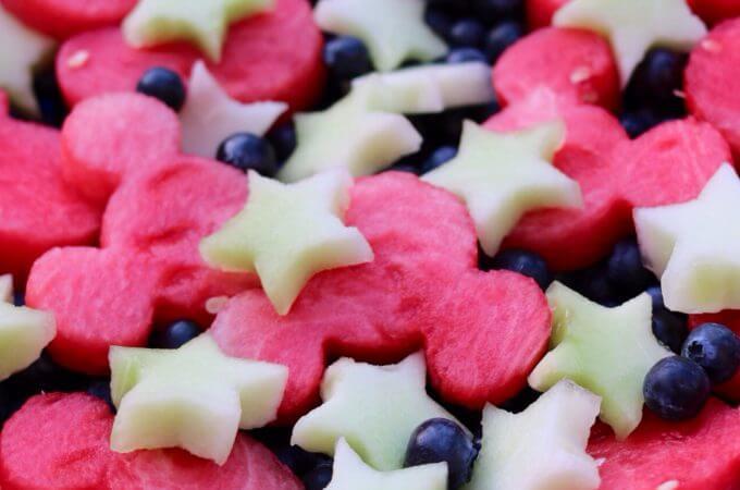 Here’s a super simple to make Fourth of July Mickey Mouse Fruit Salad that will show your #Disneyside. You will need: 1 medium seedless watermelon 1 large honeydew melon or other white or near white fleshed melon. 2 small containers of blueberries Mickey Mouse cookie cutter small star shaped cookie cutter To make the shapes…