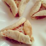 Need a quick, super easy snack for your kid’s Purim party at pre-school? Note to the non-Jews: Technically these are just Pita Pizzas ok? They are triangular-hat-shaped because the villian of the Purim story, Haman, wore a triangular hat. And now we eat his hat. Yum. Mostly we eat “Hamantaschen” that are cookie-like and sweet….
