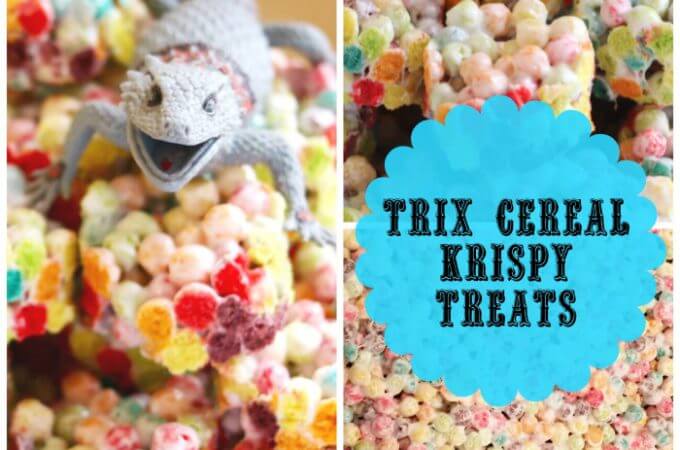 We were torn what to call these. Snake Cakes? Lizard Egg Patties? By the time we were through arguing and brainstorming, they were GONE. These were a big hit at my son’s Reptile Birthday Party. They were super easy. Just follow your fave Rice Krispy Treat recipe and sub in Trix cereal for the…